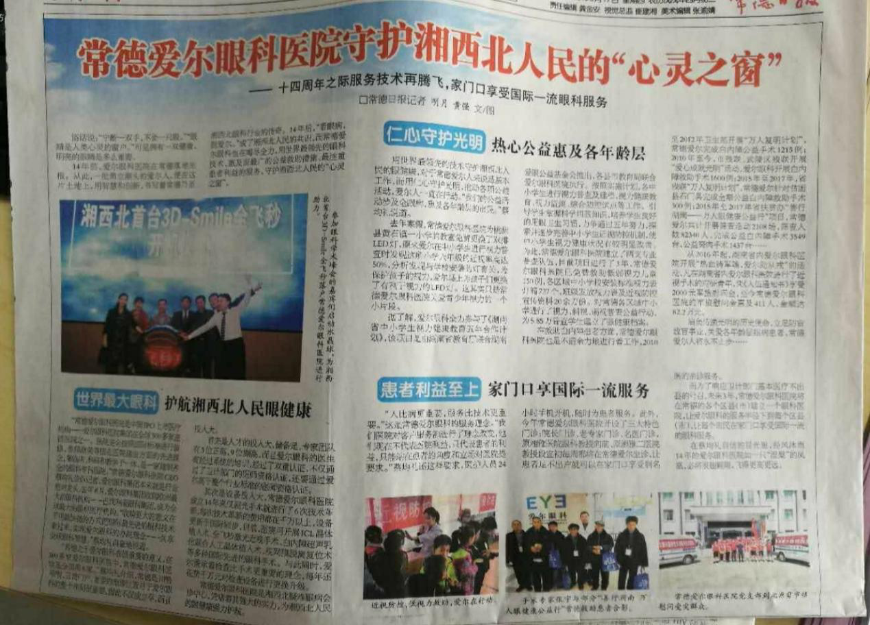2018年常德市扶贫办、市卫计委联合常德爱尔眼科医院,在全市范围内开展“善行湖南-万人眼健康公益行”活动,通过实施公益手术,帮助贫困白内障和翼狀胬肉患者重见光明,为常德市建档立卡贫困户眼疾患者实施白内障、翼狀胬肉全额公益救助手术。该项公益项目将持续至2020年。