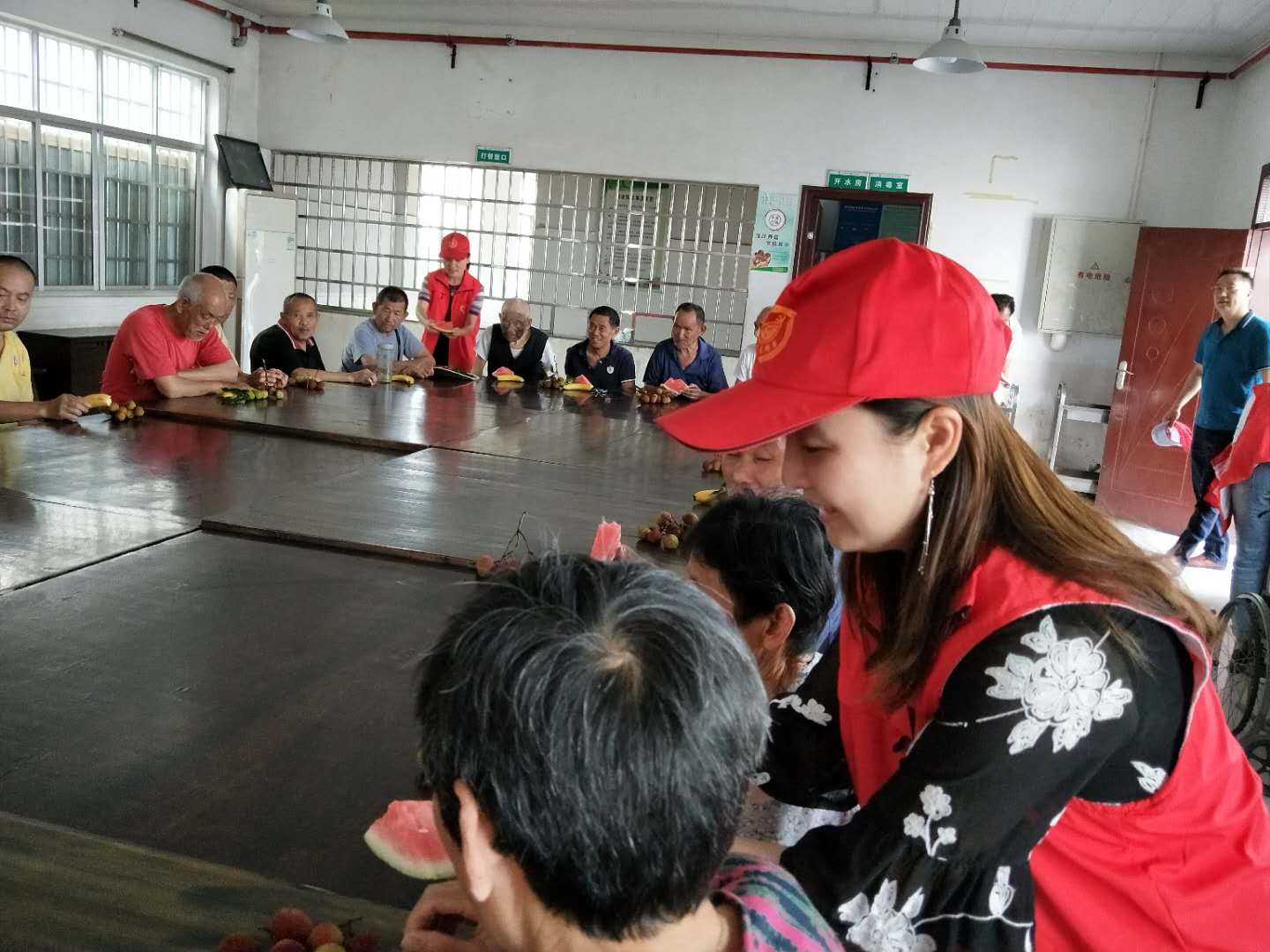 干部职工们首先来到敬老院食堂,与同坐的老人们交流谈心,并为他们递上洗切好的水果,共享节日的快乐。