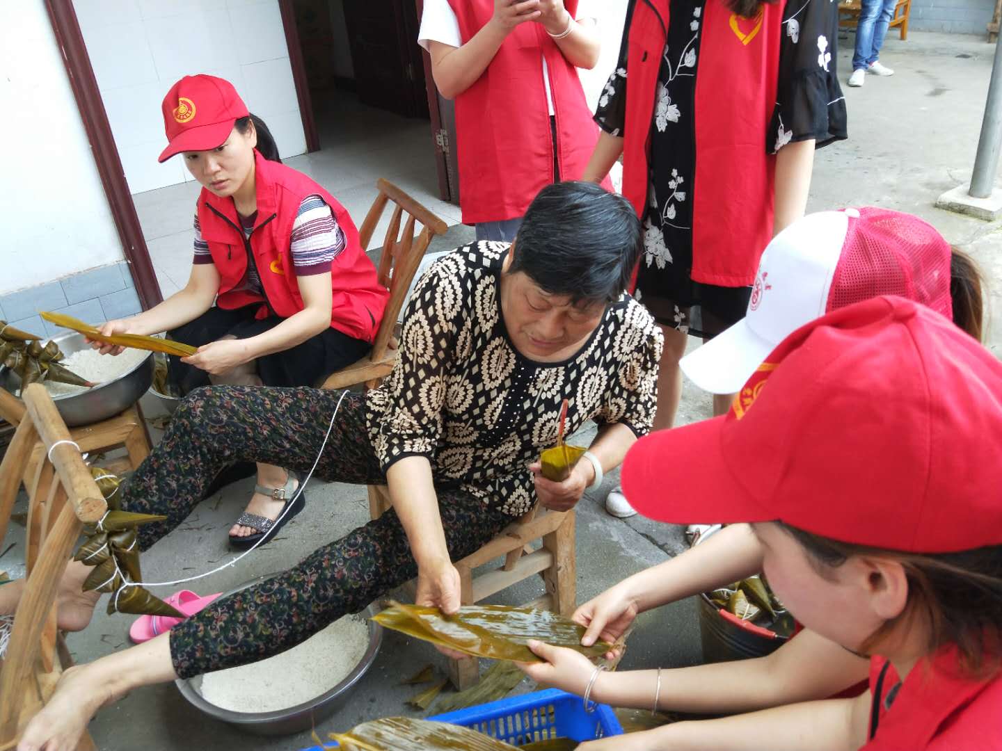 干部们为老人包粽子