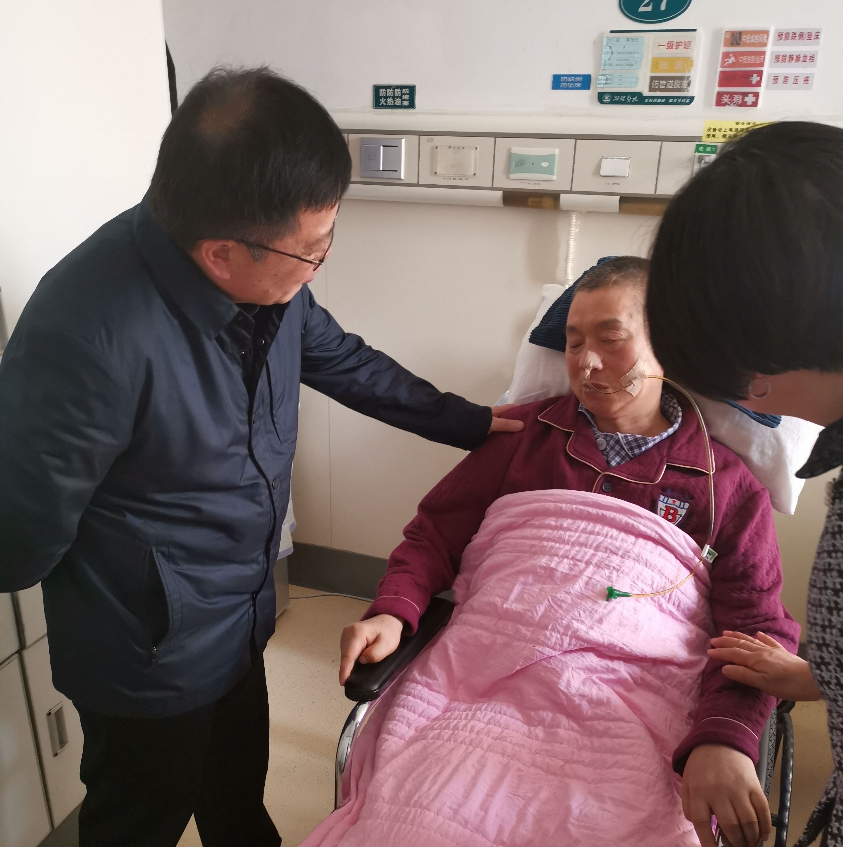 贺丽君首先看望了原驻石门县三圣乡山羊冲村的扶贫工作队员蒋登高。蒋登高驻村期间,致力于改善基础条件,积极争取道路建设、安全饮水、电网改造、住房改善等项目和资金,完成基础设施投入近亿元,山羊冲村获评第五届全国文明村镇。2018年10月,蒋登高在入户走访途中,不幸发生交通事故造成重伤,至今仍在医院。