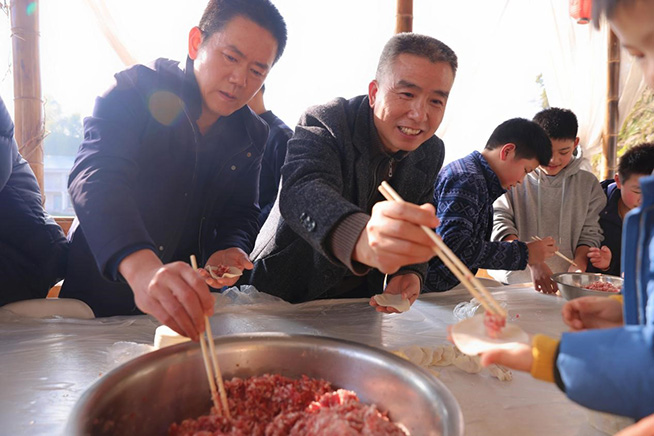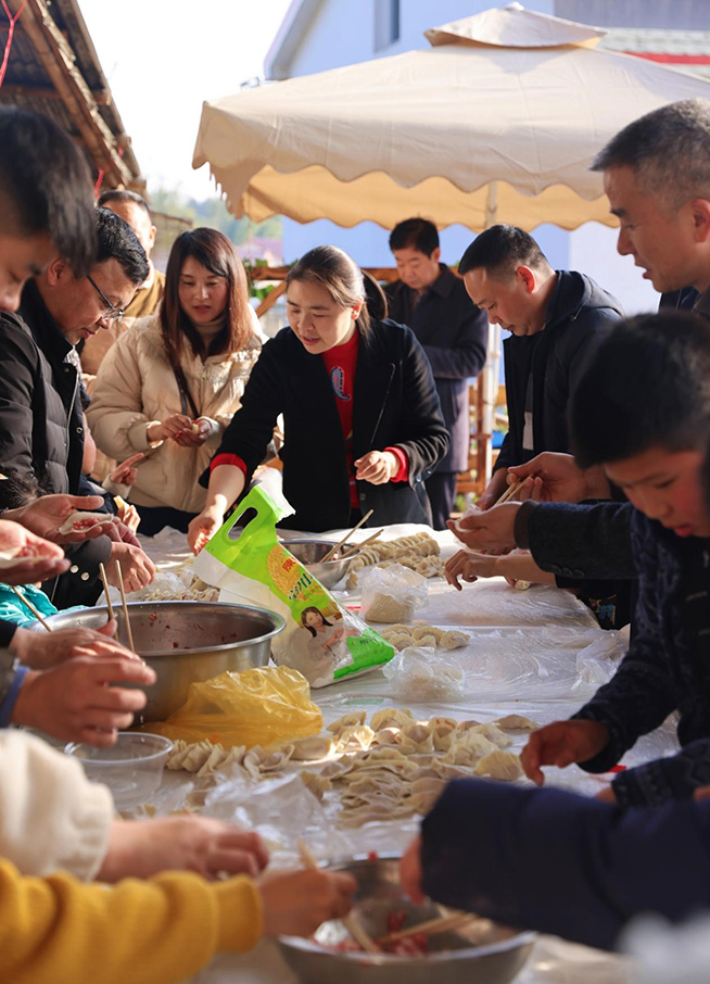 比赛中,参赛队员纷纷使出看家本领,揉面、擀皮、包饺子、摆图案一气呵成,把赛场变成了“战场”。大家个个表情专注,动作娴熟,笑声不断。很快,随着一双双灵巧的手在面团、饺子馅之间来回舞动,摆盘里花式各样的饺子作品也一个个多了起来。
