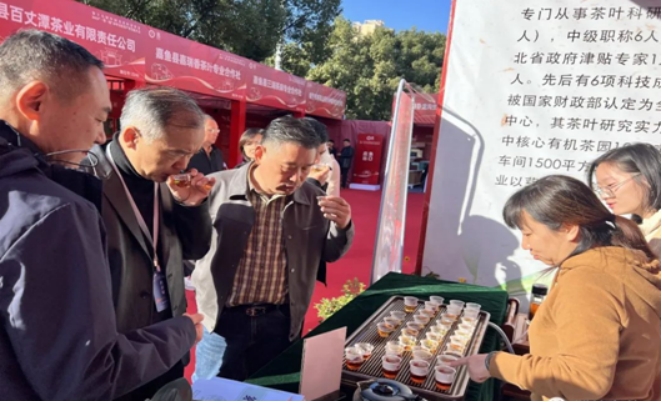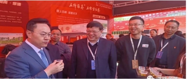 第二十届中央候补委员、中国工程院院士、湖南农业大学教授刘仲华(左1)、湖南省茶叶产业协会会长周重旺(中)在石门渫峰名茶有限公司展位前品尝“石门红茶”。