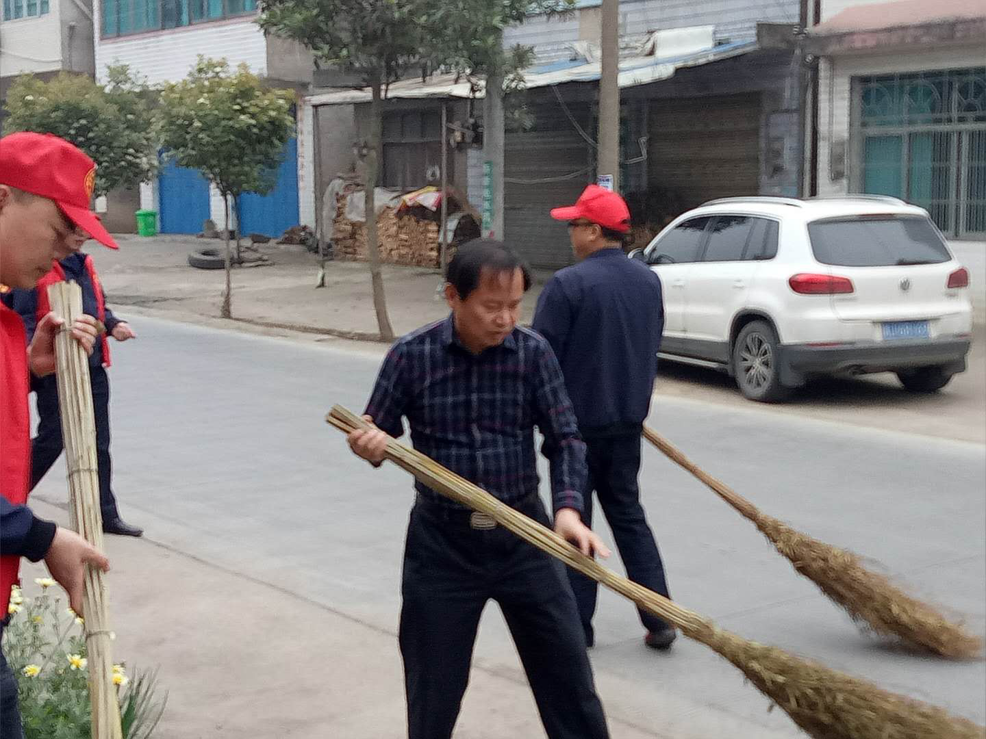 所有结对帮扶干部穿着红色志愿服务服装,戴着红色帽子,有的清理路边的树枝和石块,有的挥动扫帚打扫路面垃圾,有的拿着铁揪、锄头清理路边沟里的杂草、淤泥。刘欣手拿一把大竹扫帚,将公路上的垃圾、树叶和碎石清扫成堆,然后用撮箕装运到垃圾车里。县妇联的几名女同志手拿火钳、垃圾袋,在杨家档河边清理垃圾。