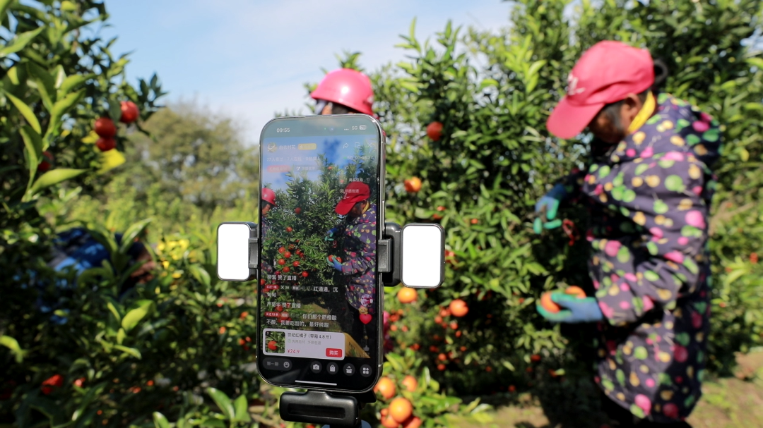 在“世纪红”果园种植基地,成熟的柑橘果在阳光的照射下泛出诱人的金红色,采摘工人们穿梭在果林间将新鲜的果实采摘入篓。除了果农,果园里还有一支特别的服务队,他们是金坪村的党员干部直播服务团队,正在通过线上平台帮助村民销售柑橘