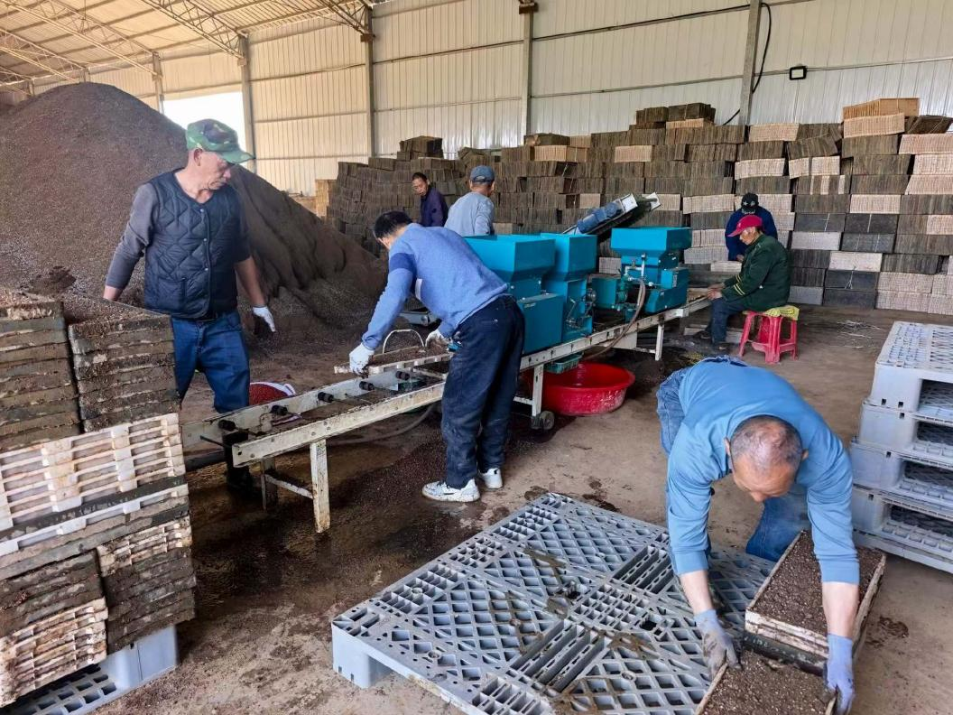 在石门县军档桥粮油专业合作社的育秧工厂中,自动化育秧生产线火力全开,从基质装填、均匀洒水、精准播种,到覆土、叠盘,育秧盘加工一气呵成,随后被集中运送至暗化出芽车间出苗。后续出芽至5毫米左右,将叠好的育秧盘随即转运至育秧大棚,通过自动化流水线摆放整齐,在温室大棚实现精准育秧,有效满足规模化种植的用秧需求。