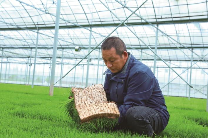 种粮大户安忠看着自己培育出来的秧苗满心欢喜。本报记者 王明睿 摄