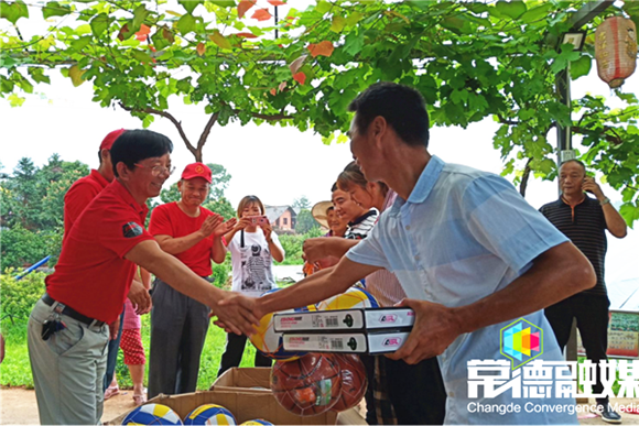 这天,他们与肖伍铺村委会交流工作、重温入党誓词,与村民一道开展团队拔河友谊赛、同心球挑战赛、两人三足趣味运动,并为社区送来篮球、排球、羽毛球、乒乓球等健身器材。常德市全民健身服务中心全体干部职工还在肖伍铺社区老街生态农庄开展采摘活动。