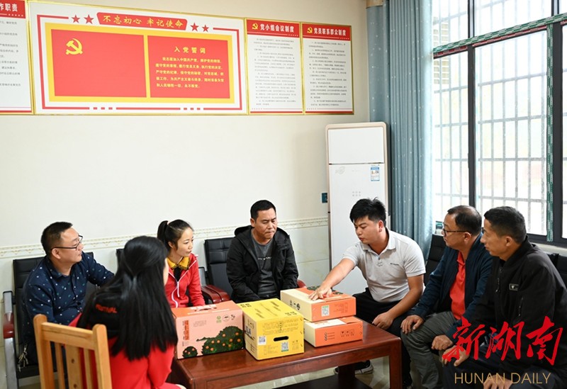(9月21日,临澧县刻木山乡岩龙村,村干部和种植户一起商议农产品的包装设计。湖南日报记者 唐俊 摄)