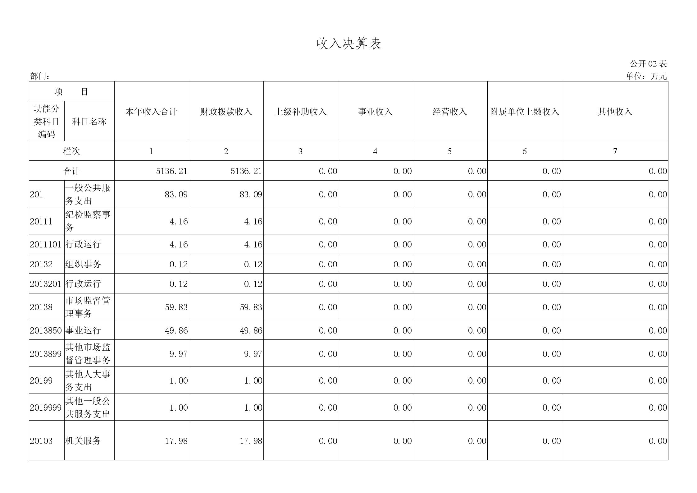 2023年度收入合计5136.21万元,其中:财政拨款收入5136.21万元,占100%;上级补助收入0万元,占0%;事业收入0万元,占0%;经营收入0万元,占0%;附属单位上缴收入0万元,占0%;其他收入0万元,占0%。