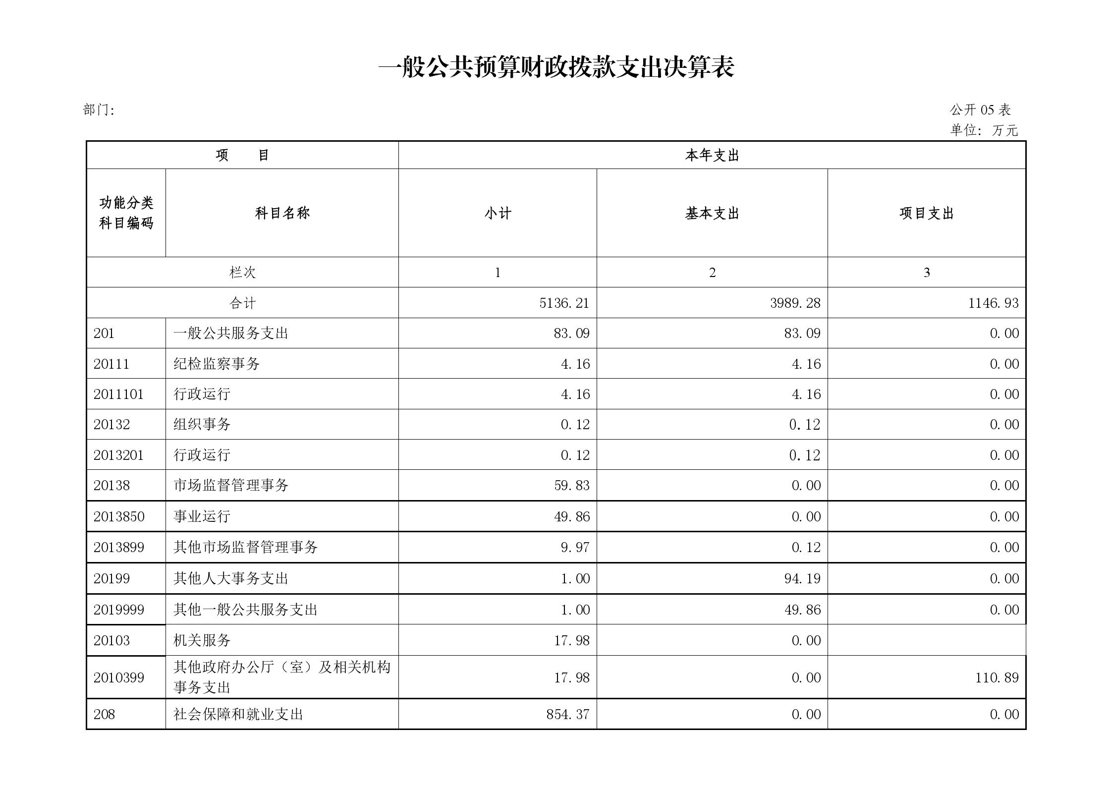 五、一般公共预算财政拨款支出决算表
