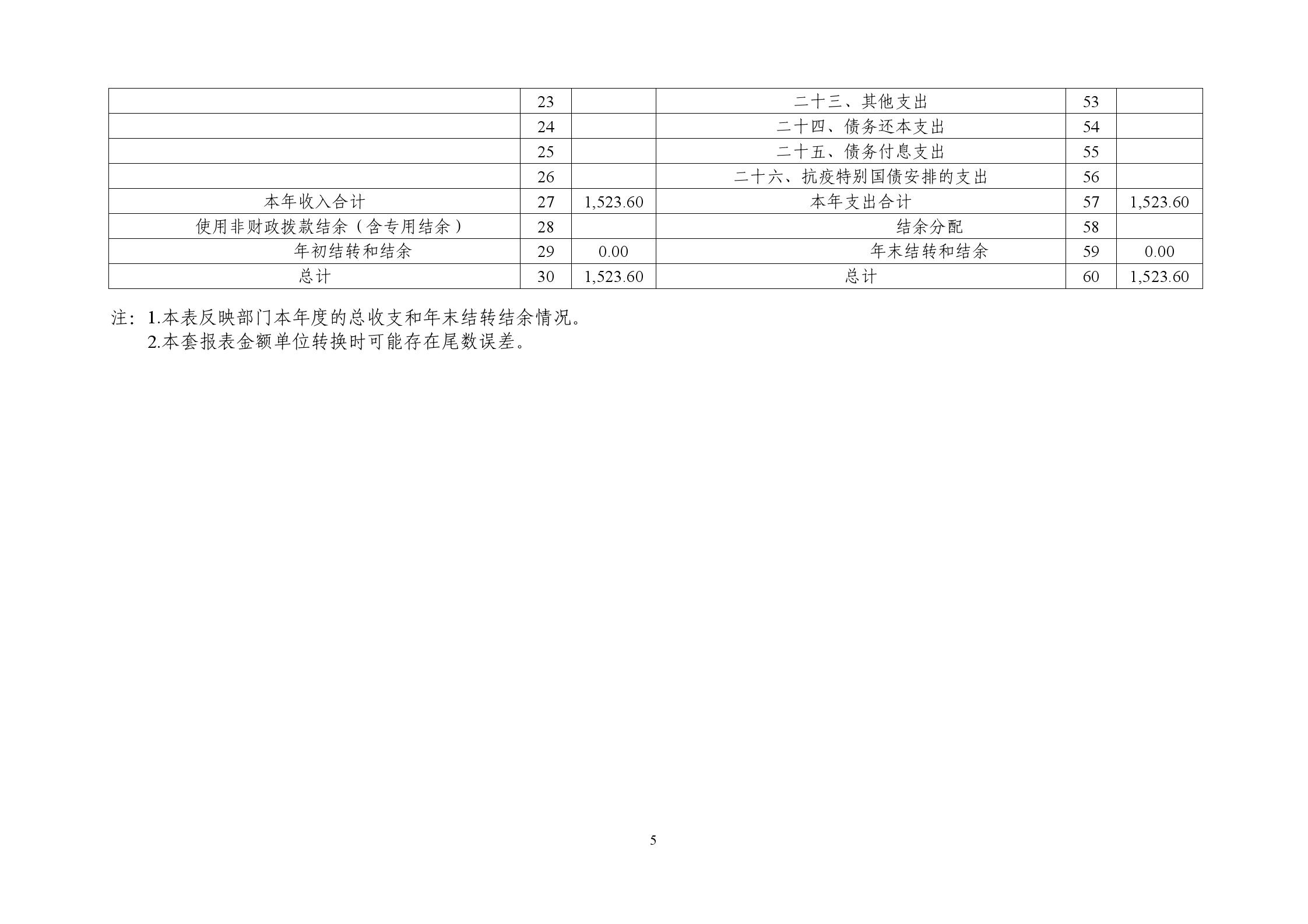2024年度财政拨款收入总计1523.60万元。与上年相比,减少85.80万元,减少5.33%,主要是因为人员经费减少。财政拨款支出总计1523.60万元。与上年相比,减少85.80万元,降低5.33%,主要是因为人员经费减少。