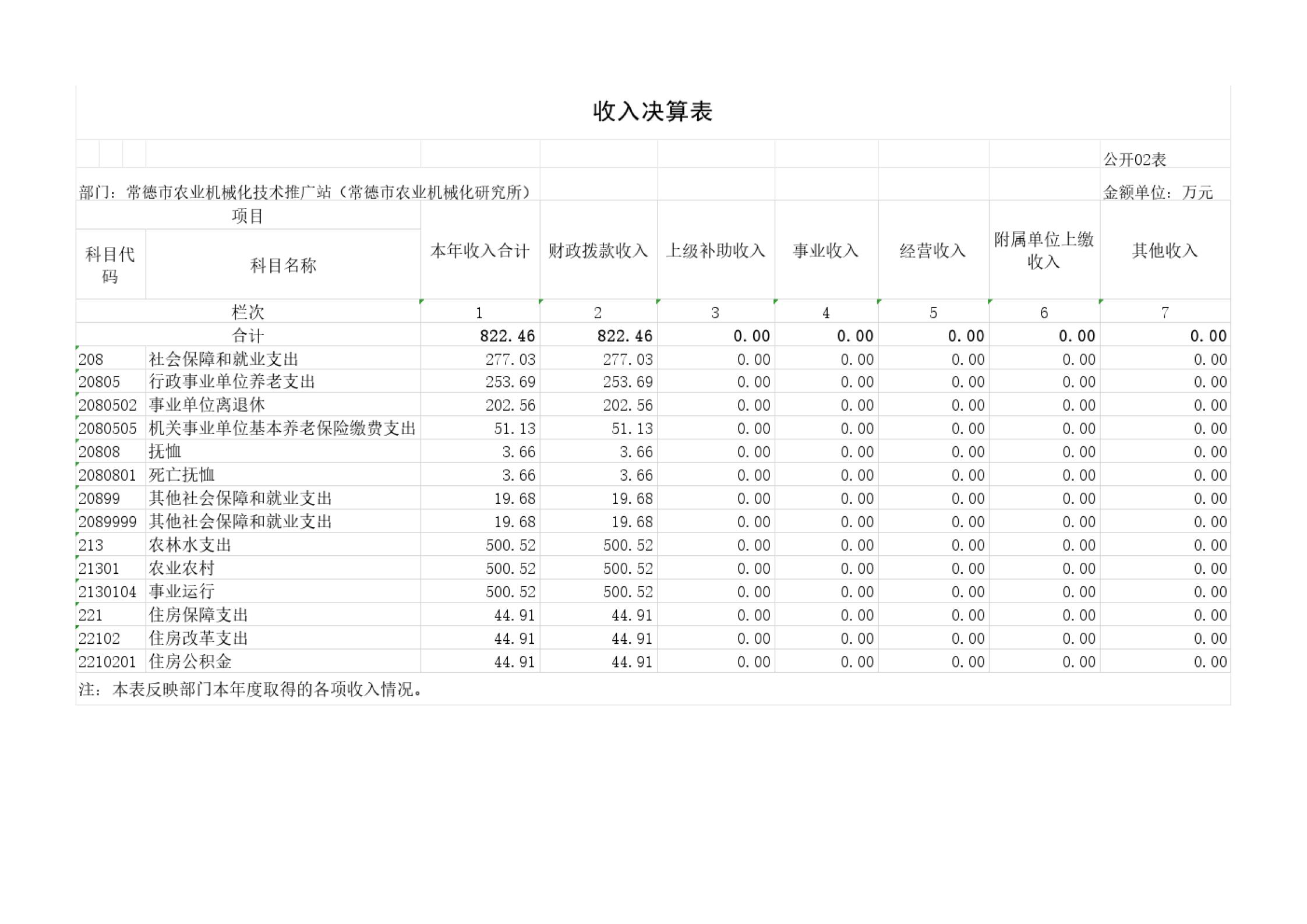 2024年度收入合计822.46万元,其中:财政拨款收入822.46万元,占100%;上级补助收入0万元,占0%;事业收入0万元,占0%;经营收入0万元,占0%;附属单位上缴收入0万元,占0%;其他收入0万元,占0%。