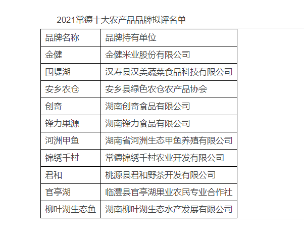 按照市委市政府工作部署,2021年,我局继续组织开展了“常德十大农产品品牌”评选活动。根据《2021常德十大农产品品牌评选办法》,由企业自主申报、区县(市)农业农村局审查推荐,全市共有21个优质农产品品牌参与评选。经过网上民意问卷调查、初步审查、专家评审、综合评定、打分排名等程序,形成了综合评分排名结果。现将排名前10名的拟评品牌名单予以公示(见附件),公示期自2022年1月26日起至30日止。公示期间,如有异议,请电话或书面形式反馈。