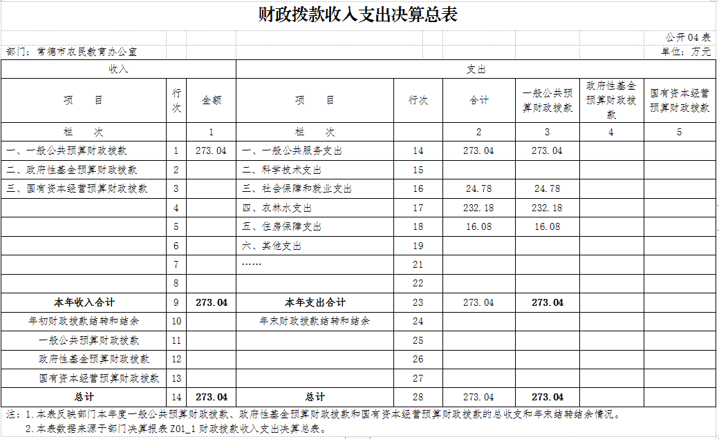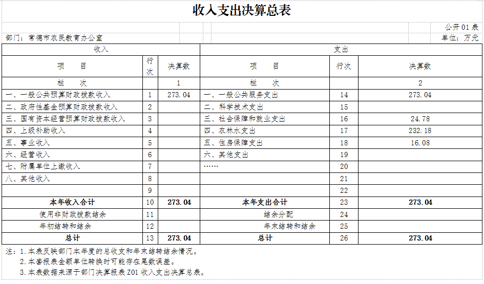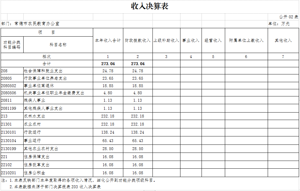 本年收入合计273.04万元,其中:财政拨款收入273.04万元,占100%;上级补助收入0万元;事业收入0万元;经营收入0万元;附属单位上缴收入0万元;其他收入0万元。
