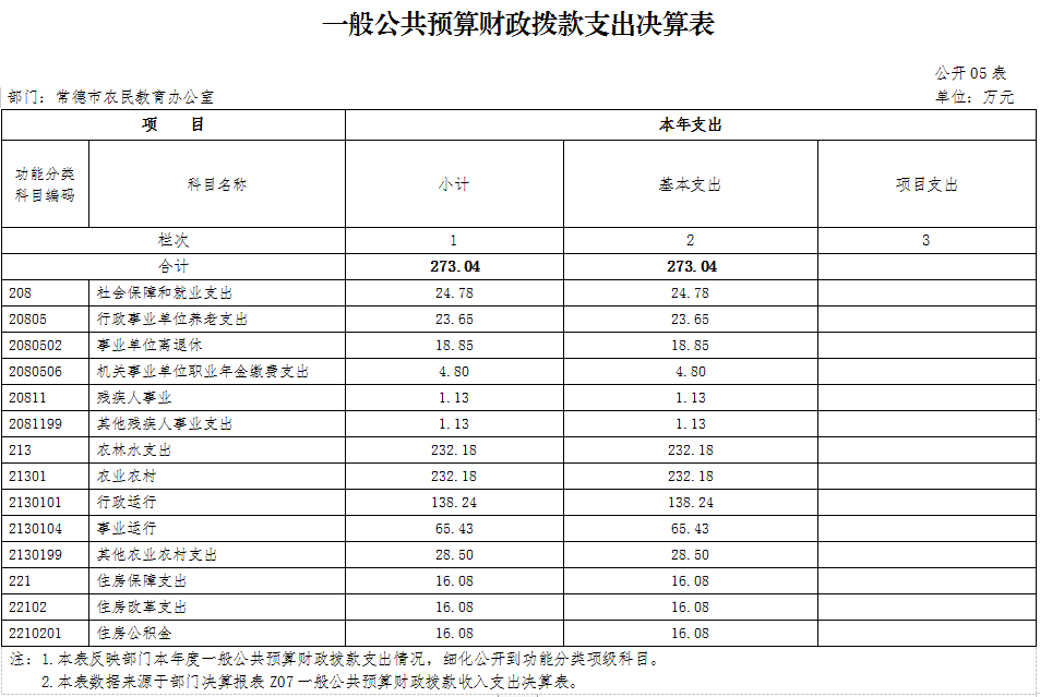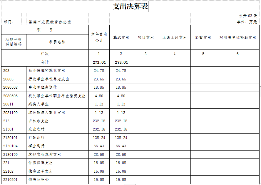 本年支出合计273.04万元,其中:基本支出273.04万元,占100%;项目支出0万元;上缴上级支出0万元;经营支出0万元;对附属单位补助支出0万元。
