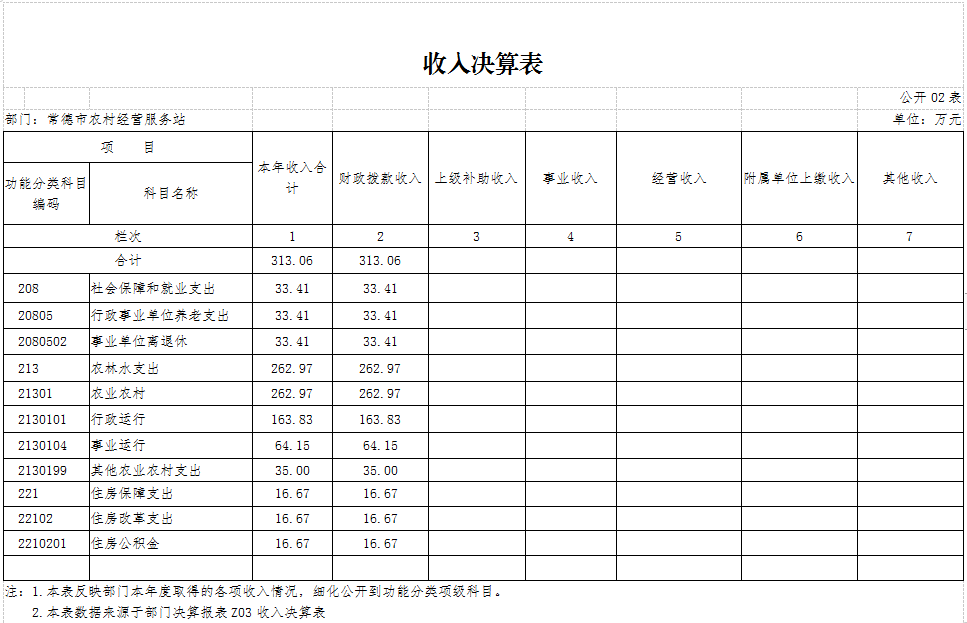 2021年度收入合计313.06万元,其中:财政拨款收入313.06万元,占100%;上级补助收入0万元,占0%;事业收入0万元,占0%;经营收入0万元,占0%;附属单位上缴收入0万元,占0%;其他收入0万元,占0%。