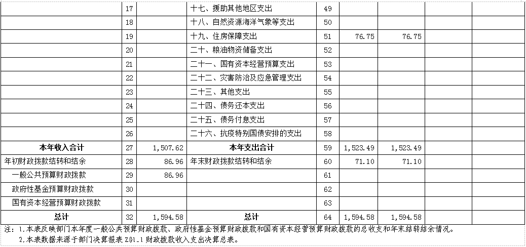 2021年度财政拨款收入总计1594.58万元,与上年相比,减少44.94万元,减少2.74%,主要是因为预算压减日常公用经费及专项经费。财政拨款支出总计1594.58万元。与上年相比,减少44.94万元,减少2.74%,主要是因为严控支出。