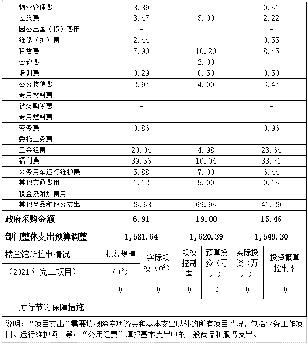 2021年度财政拨款基本支出1377.12万元,其中:人员经费1267.35万元,占基本支出的92.03%,主要包括基本工资、津贴补贴、奖金、机关事业单位基本养老保险缴费、职业年金缴费、职工基本医疗保险缴费、其他社会保障缴费、住房公积金、其他工资福利支出、离休费、退休费、生活补助、奖励金、其他对个人和家庭的补助;公用经费109.76万元,占基本支出的7.97%,主要包括办公费、印刷费、咨询费、水费、电费、邮电费、物业管理费、差旅费、维修(护)费、租赁费、公务接待费、工会经费、福利费、公务用车运行维护费、其他商品和服务支出等。