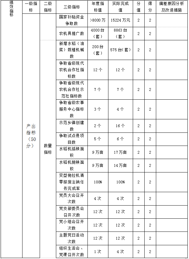 绩效目标完成情况:积极争取国家农机购置补贴资金15224万元,全年推广农机具8863台(套),绩效目标完成。