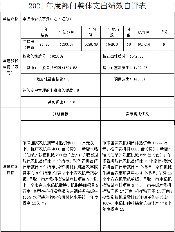 本单位高度重视绩效自评工作,积极落实主体责任,切实加强组织领导,按照绩效评价相关规定,认真开展自评,经综合评价,市农机事务中心 2021年部门整体支出绩效评价得分97分,详细情况见附件。下一步将对存在的问题进行积极整改,并按要求进行信息公开。